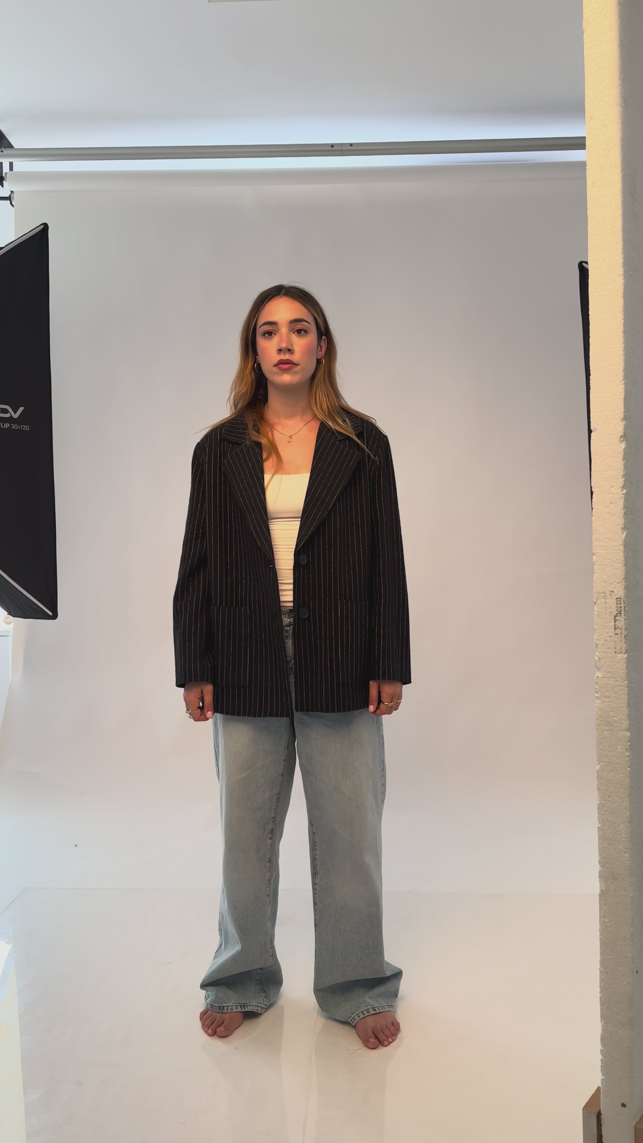 Un clásico reinventado. Esta americana oversize, confeccionada en suave franela con diseño de raya diplomática, aporta un aire sofisticado y relajado a la vez. Su silueta amplia permite crear looks modernos y versátiles, ideales tanto para la oficina como para un outfit urbano con personalidad.